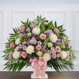 Price: $109.99 Heartfelt Tributeâ„¢ Lavender & White Floor Basket Arrangement Product Tags: Same-day Delivery